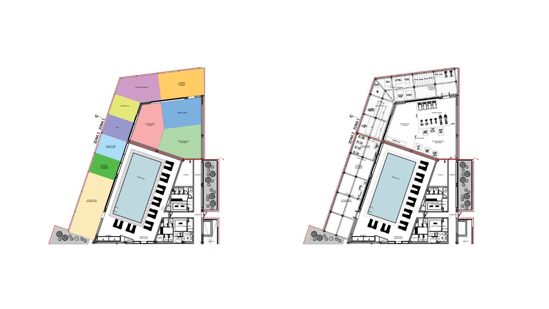 • The layout of a gym space into schematic areas divided by training style and equipment genre, for example cardio, yoga / stretching, functional training, strength machines, and so on.